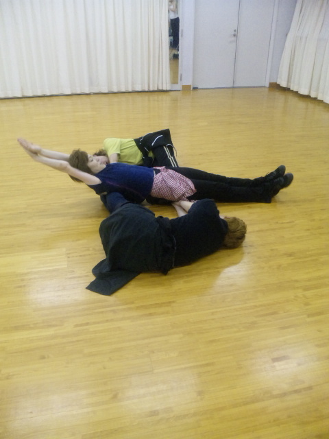 広いお稽古場で、実際の広さをイメージし、位置の修正や移動の計算などなど・・・